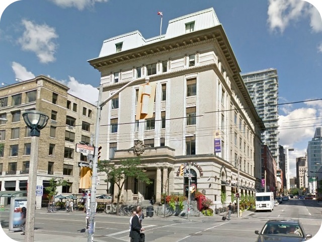 This 2012 Heritage Toronto plaque attached to a metal railing outside this building on the northwest corner of King Street West and Simcoe Street has this to say: