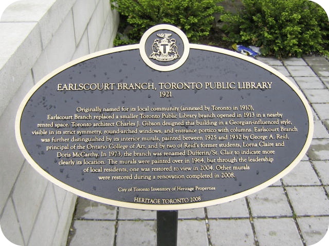 At 1625 Dufferin Street, just south of St. Clair Avenue West, is what used to be called Earlscourt Branch of the Toronto Public Library. Now the Dufferin/St. Clair Branch, this 2008 Heritage Toronto plaque in front has this to say: