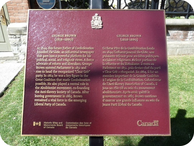 The federal plaque reflects George Brown's designation as a "national historic person". It's placed next to his house, which is separately designated a national historic site. But there is no plaque for the site, only the person, despite the house being a NHS since 1976. The house is available to rent for group events, but is sadly closed to the public most of the time, though it has had an open house one weekend each May during Doors Open. Upper floors contain offices for various groups. -Wayne